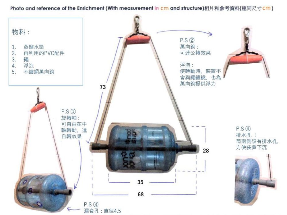 「沙地滾筒餵食器」由蒸餾水桶、再利用的PVC配件、繩子、浮標、不鏽鋼萬向鉤、膠鏈條組合而成。
