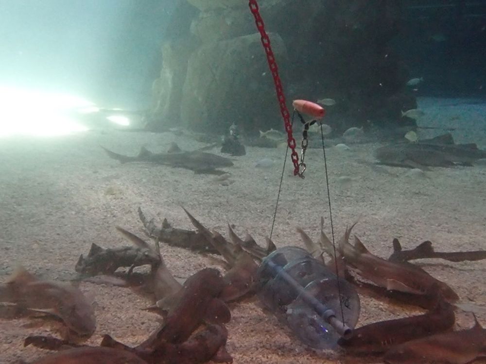 首先會將魚餌放進具有孔洞的水桶中,再扣好行豐設備的兩端後,即可將其拋向水中。透過使用「沙地滾筒餵食器」行為豐富化設計,模擬野外洞穴、石頭裂縫、海藻叢的形式,引導條紋斑竹鯊能靠嗅覺、味覺、觸覺尋找漏食孔位置,進而刺激牠們自然覓食行為。而漏食孔位置也會因個體活動改變方向,讓牠們尋找食物的時間增加。莫可瑩開心分享,透過行豐物成功使牠們進食過程延長至14~17分鐘,完全比以往多5~7分鐘的活動時間。