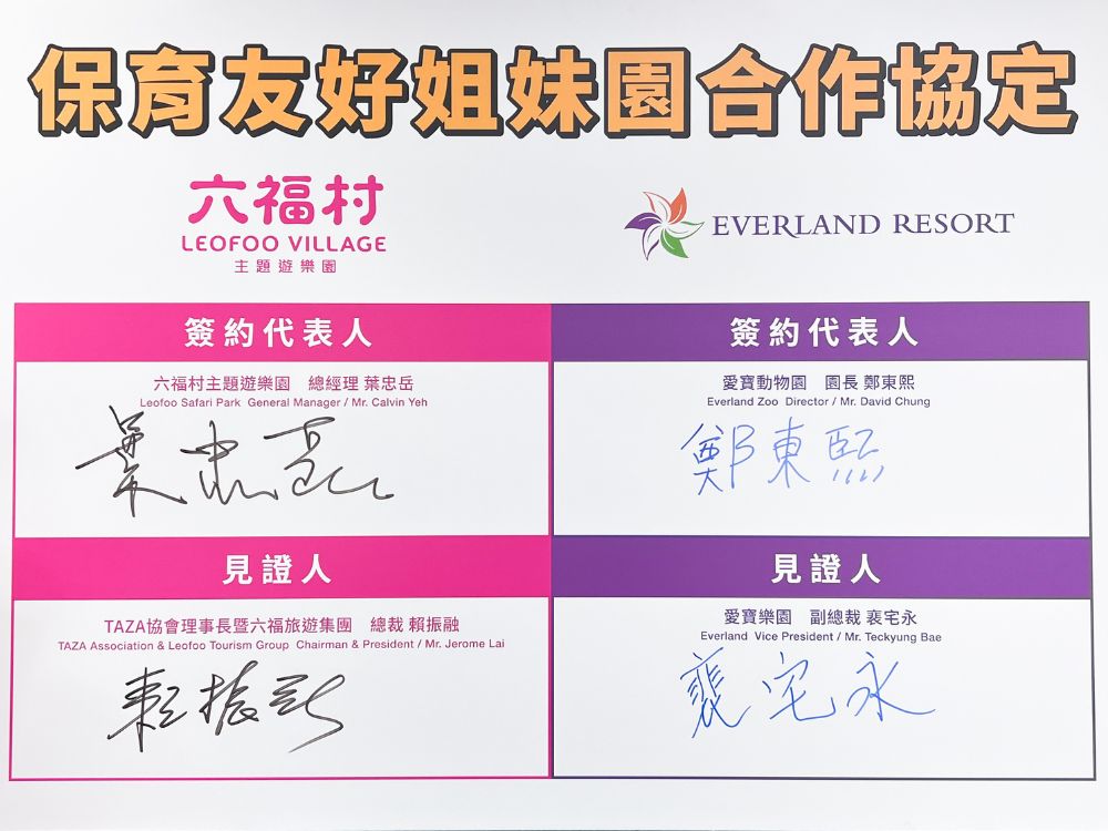 在六福旅遊集團總裁暨莊福文教基金會董事長 賴振融和愛寶樂園副總裁 裵宅永見證之下,兩園正式締結為姊妹園,