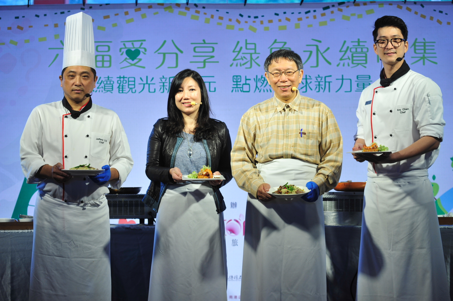 臺北市市長柯文哲帶著北市觀光大使「熊讚」現身相挺綠色公益行動,為了提倡惜食運動,呼應五星級飯店鼓勵大家打包的政策,柯文哲市長還綁上廚師圍裙和六福旅遊集團莊豐如執行長搭配五星主廚一起PK天菜料理,教民眾把吃不完的剩餐,經過巧手烹調變成另一道新菜色。